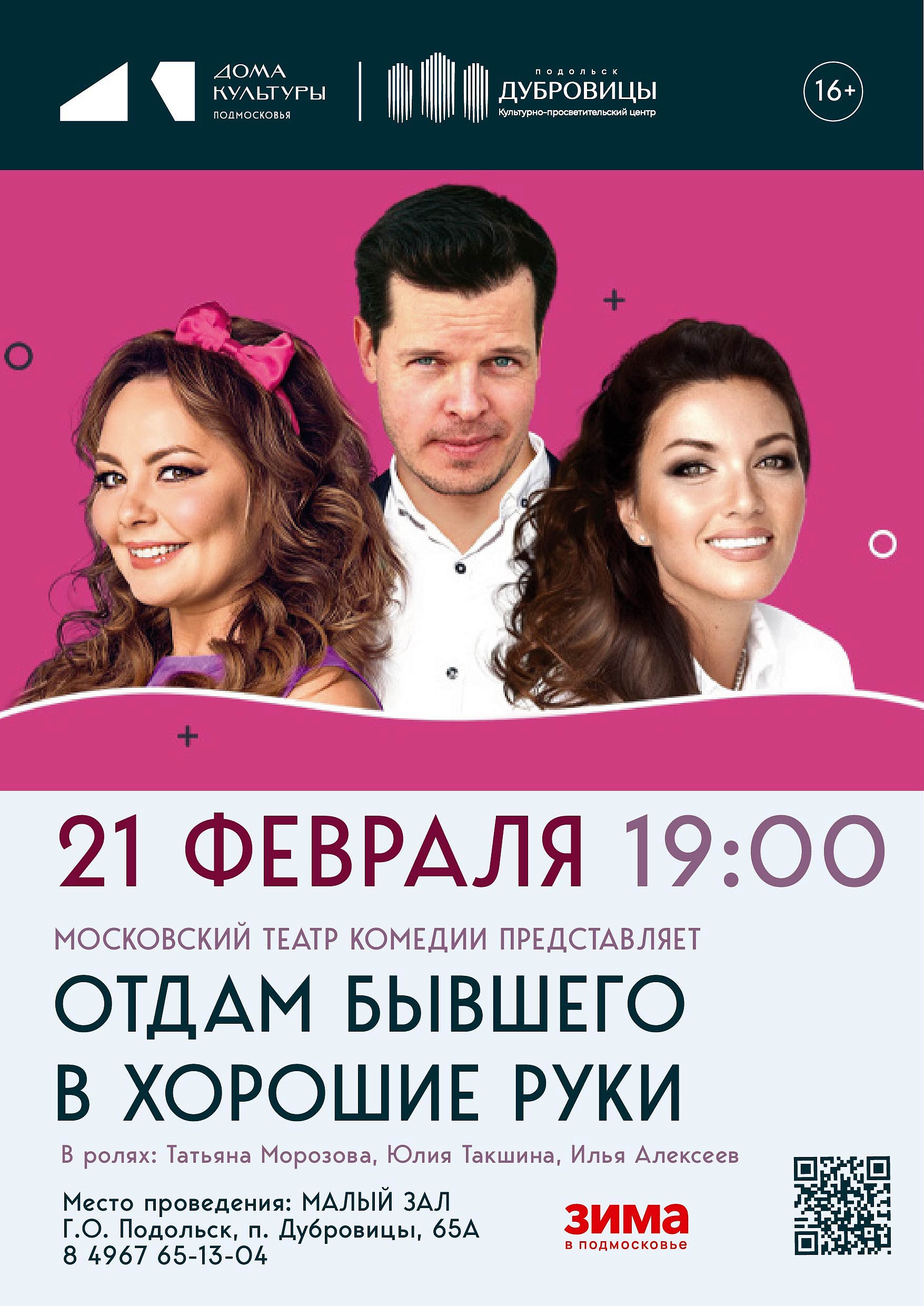 21 февраля в 19:00 КПЦ «Дубровицы» приглашает на спектакль «Отдам бывшего в хорошие руки», который представят артисты Московского театра комедии: Татьяна Морозова, Юлия Такшина и Илья Алексеев.