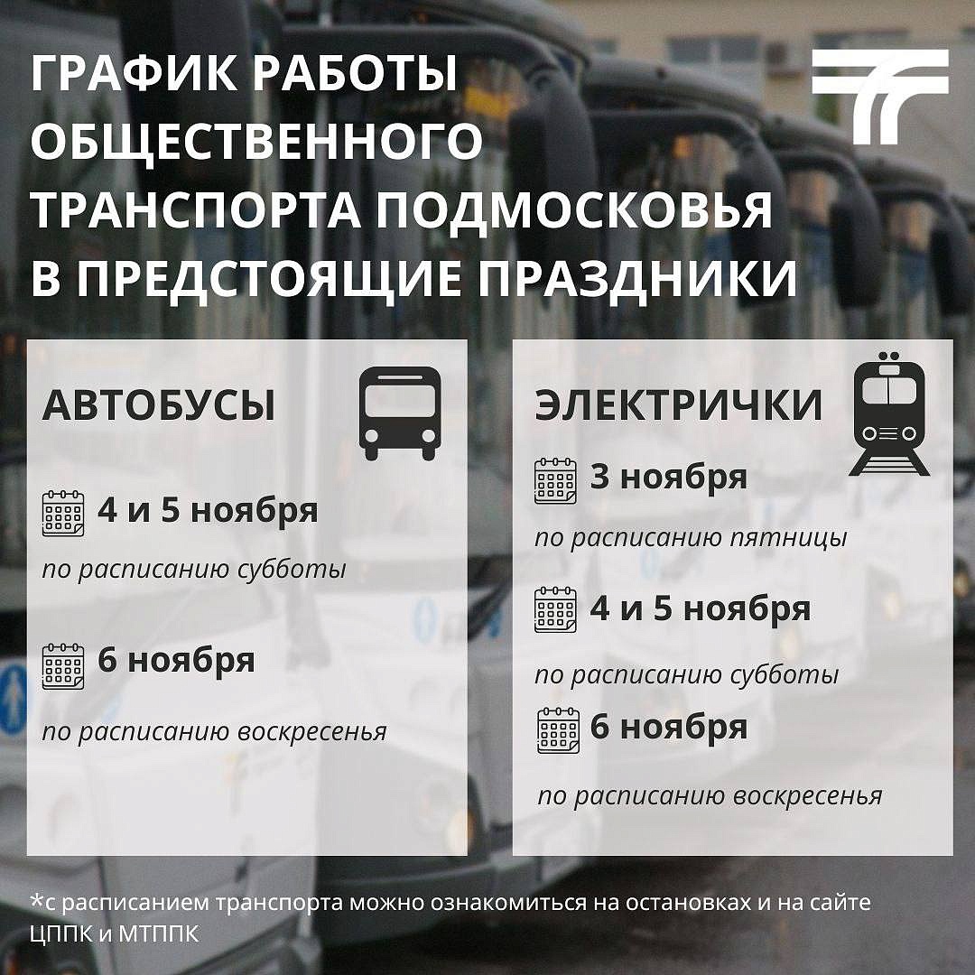 С 4 по 6 ноября общественный транспорт региона будет работать по расписанию выходных.  Об этом сообщает Минтранс МО.