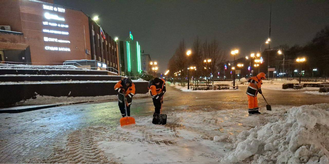 На муниципальных дорогах и общественных территориях работают 279 человек и 42 единицы техники. Они убирают снег на дорогах, тротуарах, пешеходных зонах.