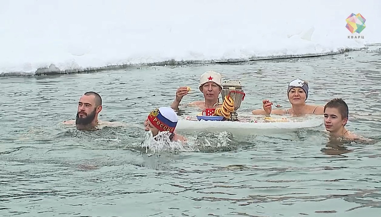 Блины золотистые, горячие, напоминающие весеннее солнышко, а едят их отважные люди по-особому. На улице минус, а у них целый пир в проруби. Не торопясь, они угощаются лакомством и продолжают веселье: через горящее кольцо нырнуть в ледяную воду в «Умке» под силу каждому.