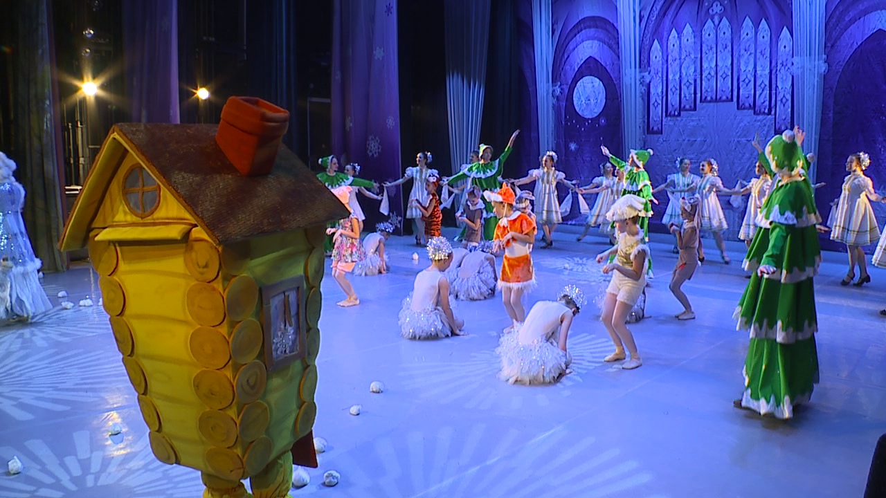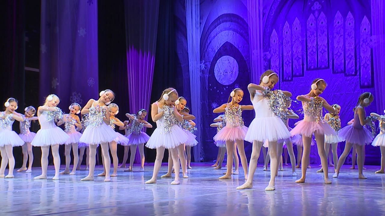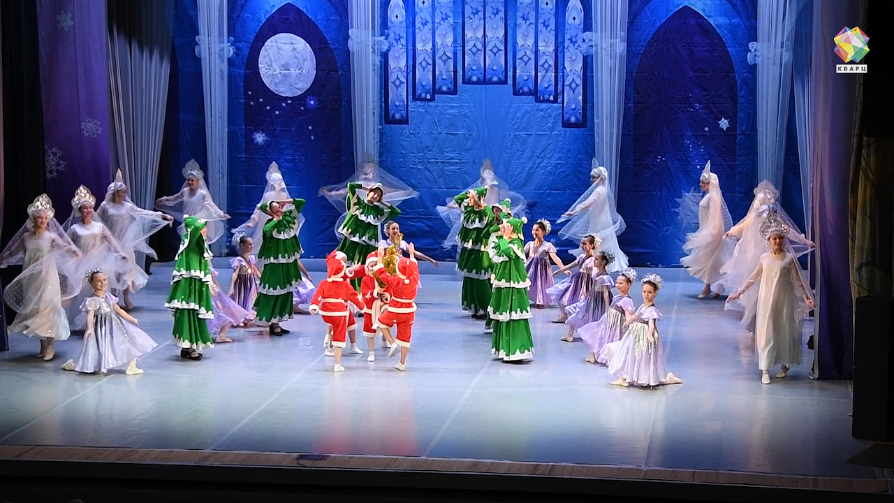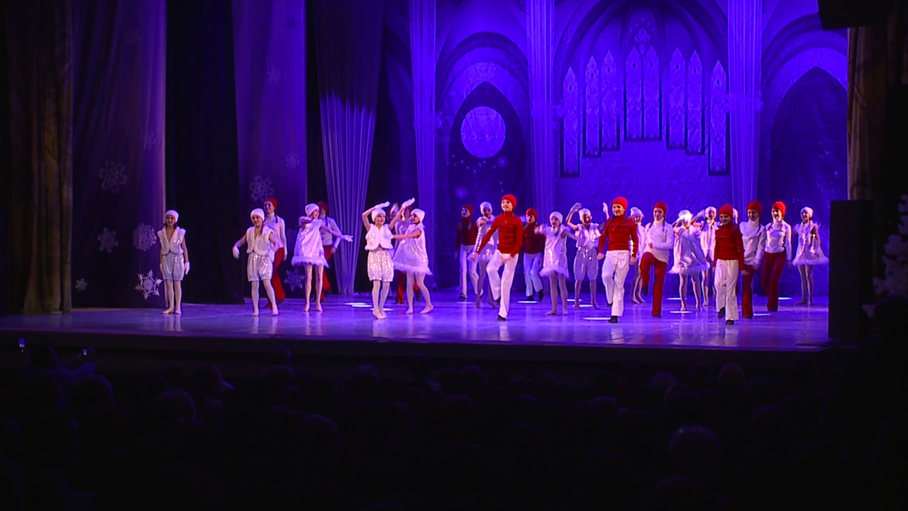 На сцену вышли абсолютно все артисты, даже первоклассники. Дебютанты исполнили танец снежинок и Санта-Клаусов.
