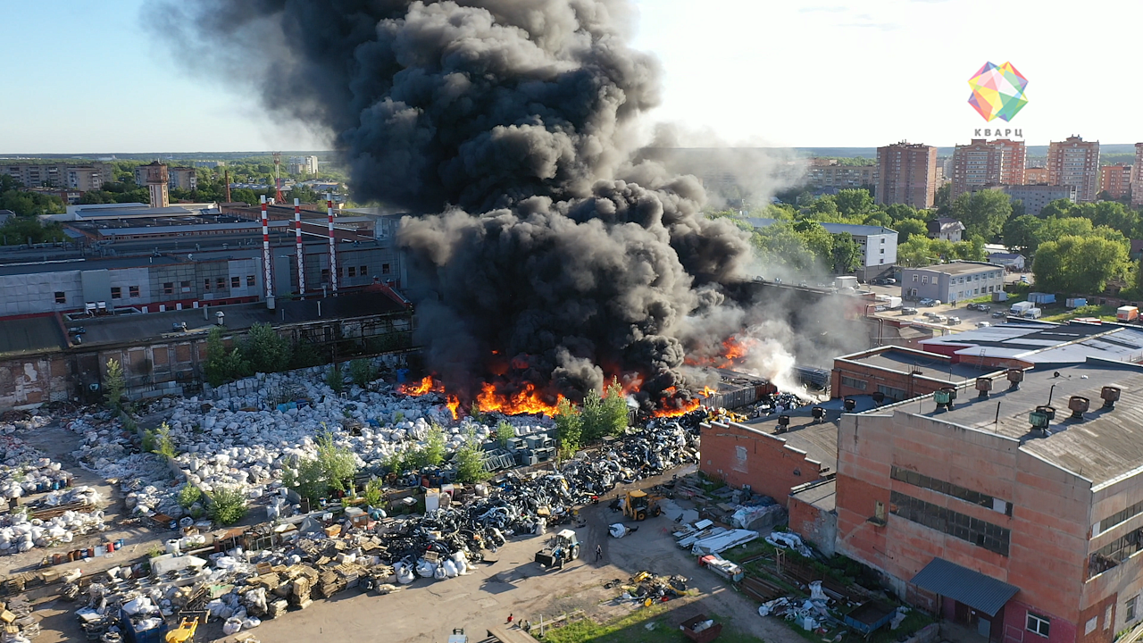 Огромные клубы чёрного дыма поднимаются с территории промзоны. На заводе по переработке пластика горит вторсырье, хранится оно на открытой площадке. Из-за сложившихся погодных условий, а точнее - сильного бокового ветра - происходит интенсивное распространение огня по складируемой продукции. На месте происшествия работают огнеборцы.