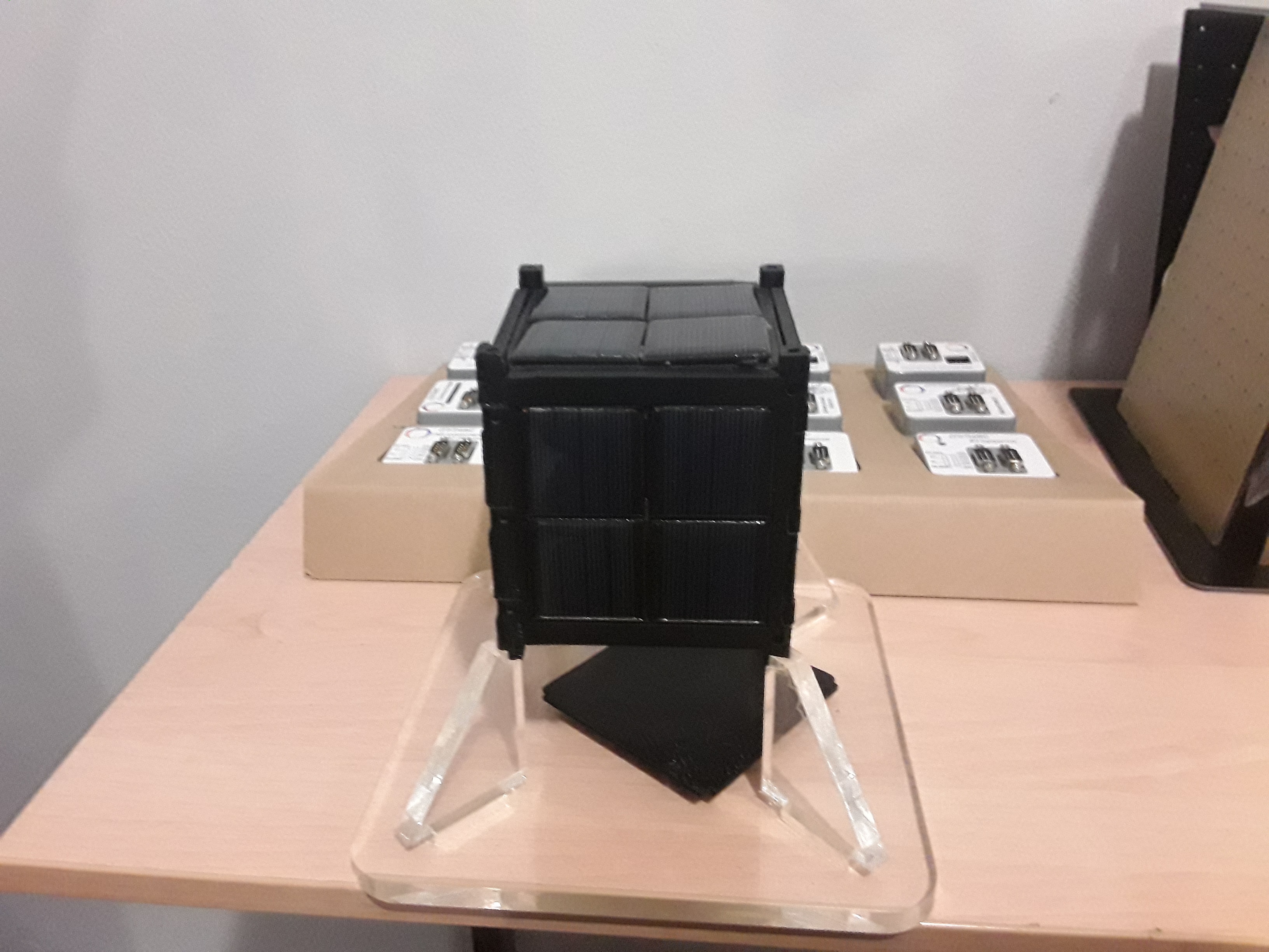 Макет спутника распечатали на 3D-принтере, обклеили солнечными батареями. Внутри аккумулятор, собирающий энергию и лампочки. Создатели планируют установить в него несколько плат. С их помощью школьники могли отрабатывать подключение к спутнику и управлением им.