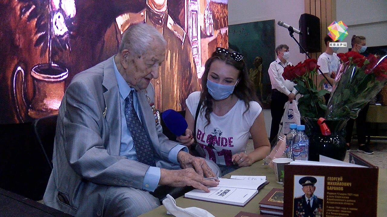 С добротой и открытостью ветеран Великой Отечественной войны Георгий Баранов сегодня обращается к каждому пришедшему. Книгу, которую презентует, не продает - просто дарит всем собравшимся, в том числе участникам «Диктанта Победы».