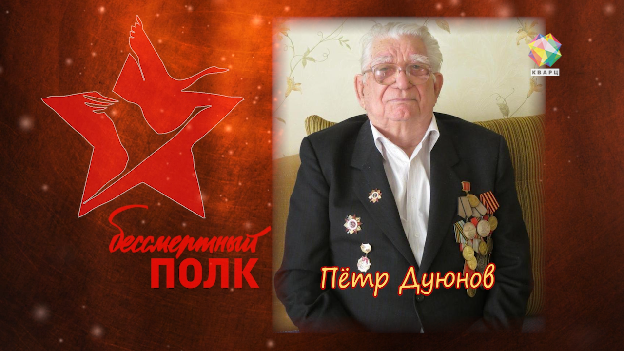 Пётр Дмитриевич Дуюнов на войну отправился в июле 43-го. В составе 308-ой стрелковой Краснознамённой дивизии форсировал Днепр, освобождал белорусские города . 24 июня 44 года огнём из станкового пулемёта пулемётчик 1-го стрелкового батальона уничтожил до взвода пехоты противника. В боях за деревню Новая Шараевщина отразил контратаку немцев, уничтожив при этом две огневые точки и 30 фашистских солдат. Награжден Орденом Красной звезды. В одном из боев был тяжело ранен.
