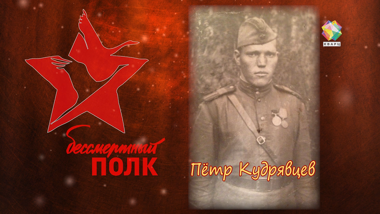 Петр Дмитриевич Кудрявцев начал службу в 41 году в 65-ой Краснознамённой стрелковой дивизии 52 армии. В ноябре участвовал в знаменитом параде на Красной площади. Через полгода уже награжден медалью «За отвагу» , в сентябре 43-го - медалью за оборону Ленинграда, в сентябре 44-го - Орденом Красной Звезды. За каждой наградой - смелость, героизм и отвага. Письма своей семье с фронта писал регулярно, хранятся они и по сей день.