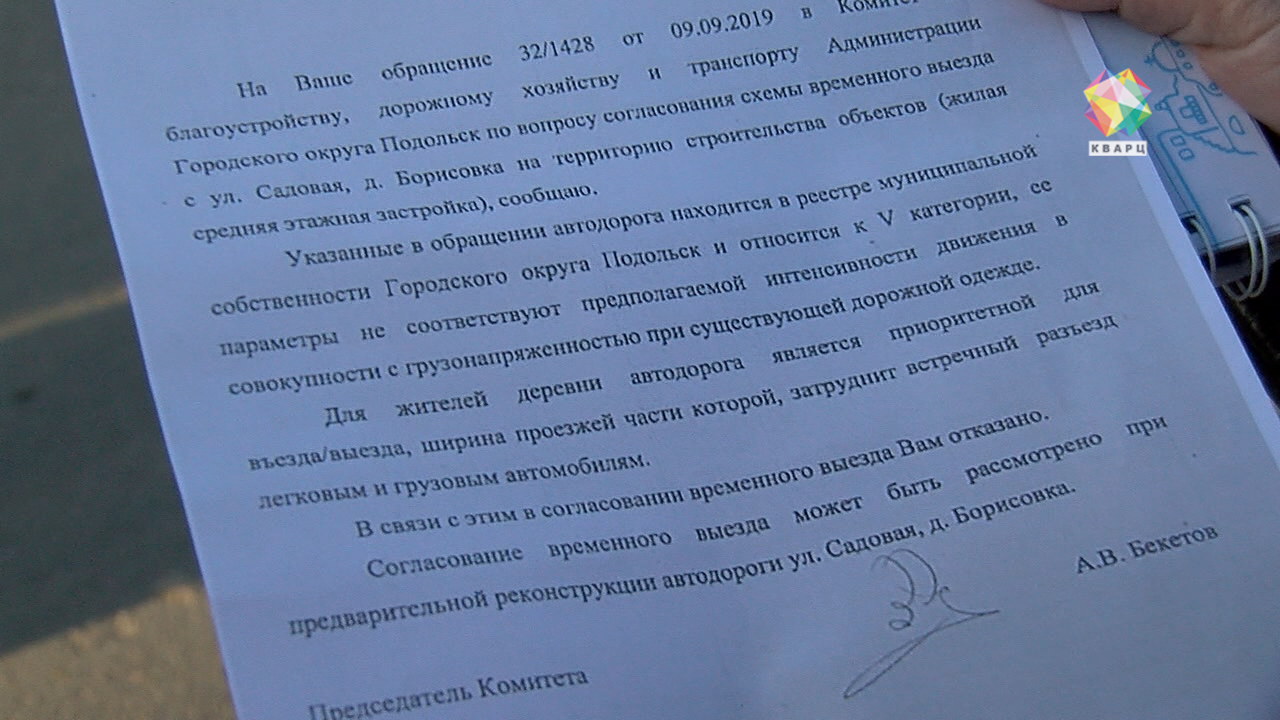 Около полутысячи жителей стали заложниками ситуации. Километр дороги, обеспечивающий въезд и выезд из деревни, отремонтировали в 2018. Люди собирали подписи, голосовали на «Доброделе» - и вот он, новый асфальт, живи и радуйся! Но не тут-то было. Кстати, разрешение на въезд машинам компании - застройщика запрещен городской администрацией, параметры дороги просто-напросто не позволяют это сделать.