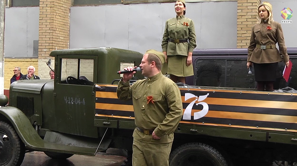 Артисты на трех автомобилях-полуторках времен войны объезжают дворы, где живут очевидцы тех героических лет.