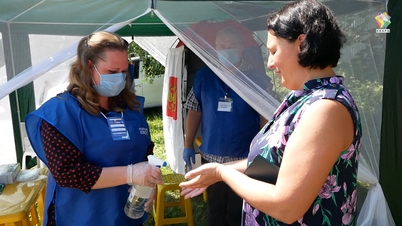 Здесь всё, как на обычном избирательном участке. Бюллетени, кабинка для голосования и члены комиссии. Только все это в специальном шатре на открытом воздухе. Именно благодаря таким передвижным пунктам избиратели могут отдать свой голос рядом с домом. Главное условие, продиктованное коронавирусом, - соблюдение всех мер безопасности.