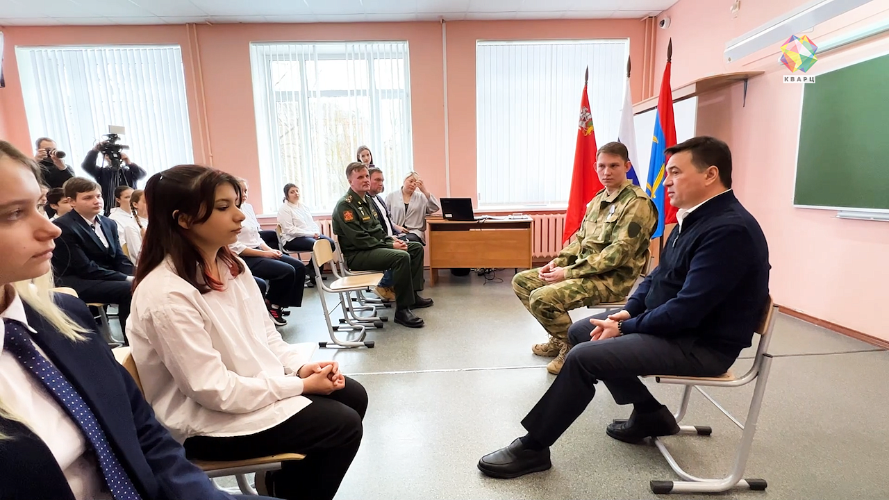 - Ты у нас герой, и Президент награду «За отвагу» присвоил. Поэтому в кругу ребят, которые здесь учатся, в присутствии ваших родителей я имею честь вручить вам эту награду, - говорит Андрей Воробьев, губернатор Московской области.