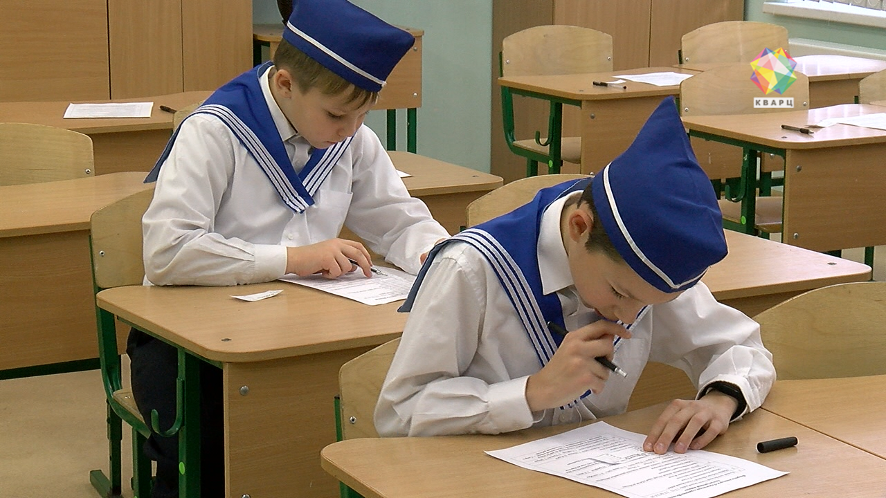 «Героические страницы Великой Отечественной войны». Тест пишут «Дружные» ребята. За партами голубые гюйсы и фуражки, 15 школа носит имя вице-адмирала Сабанеева.