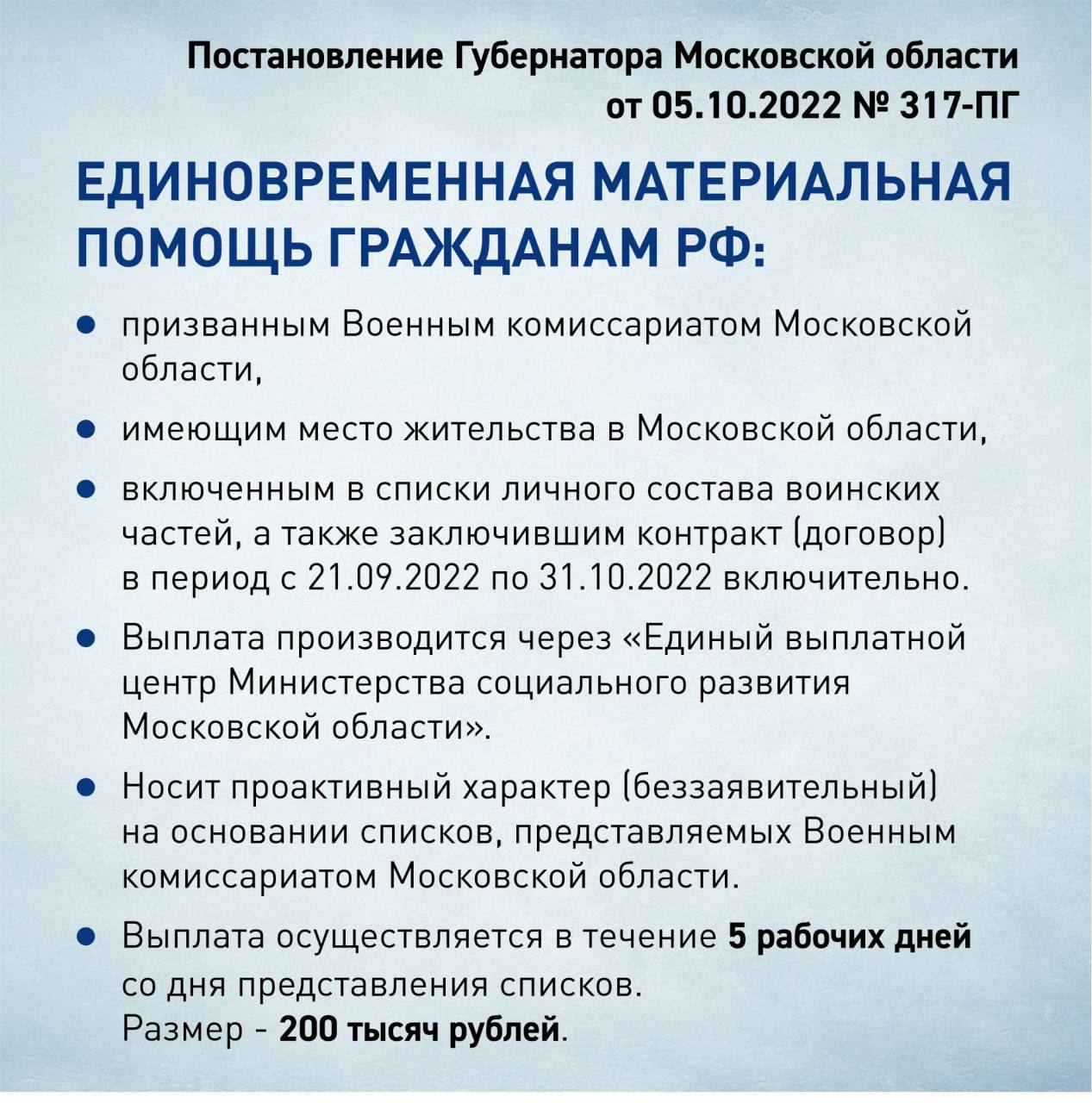 Губернатором Московской области Андреем Воробьёвым утвержден ряд мер социальной поддержки граждан РФ, призванных на военную службу по мобилизации в Вооруженные Силы Российской Федерации, а также их семьям.