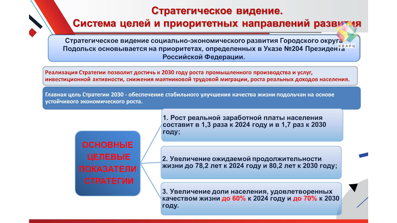 Приоритеты распределены и в экономическом развитии, и в развитии высокотехнологичного промышленного комплекса, и в научных исследованиях и разработках. Стратегия социально экономического развития Подольска охватит период до 2030 года. К тому времени планируется повысить зарплату горожан в полтора раза. Продолжительность жизни увеличится в среднем до 80 лет.
