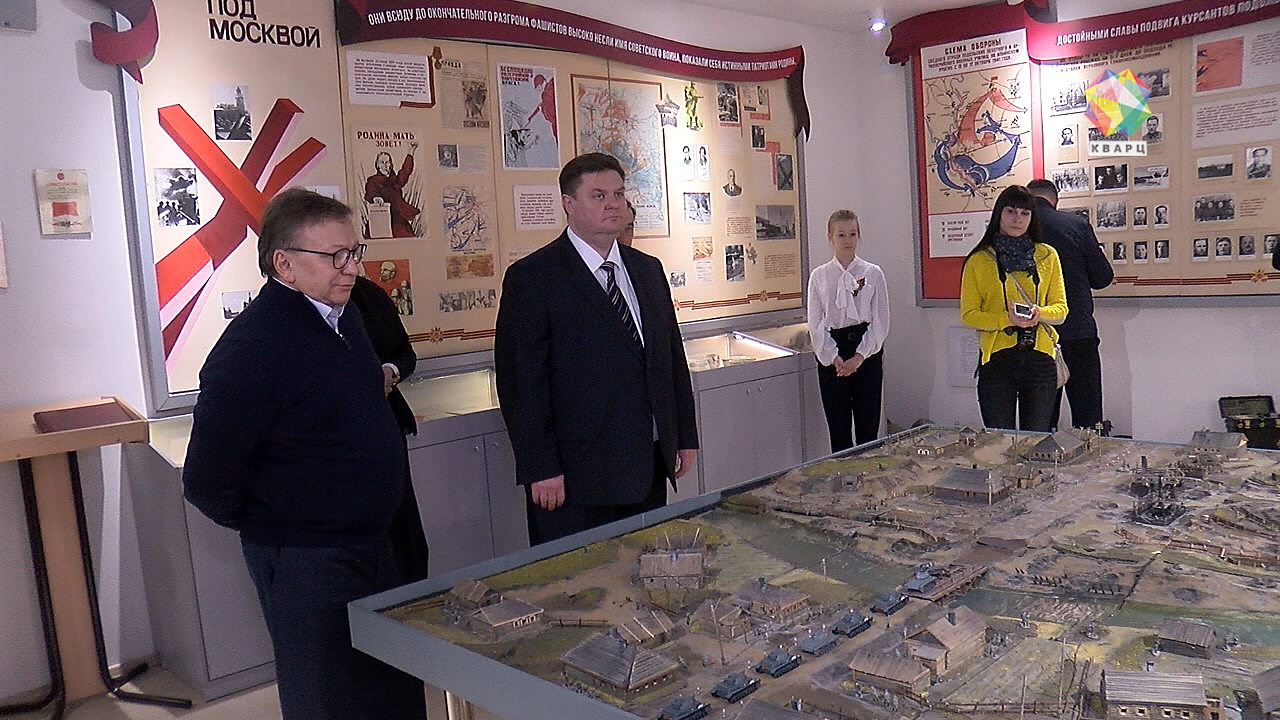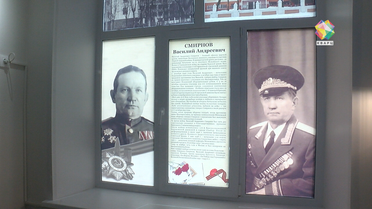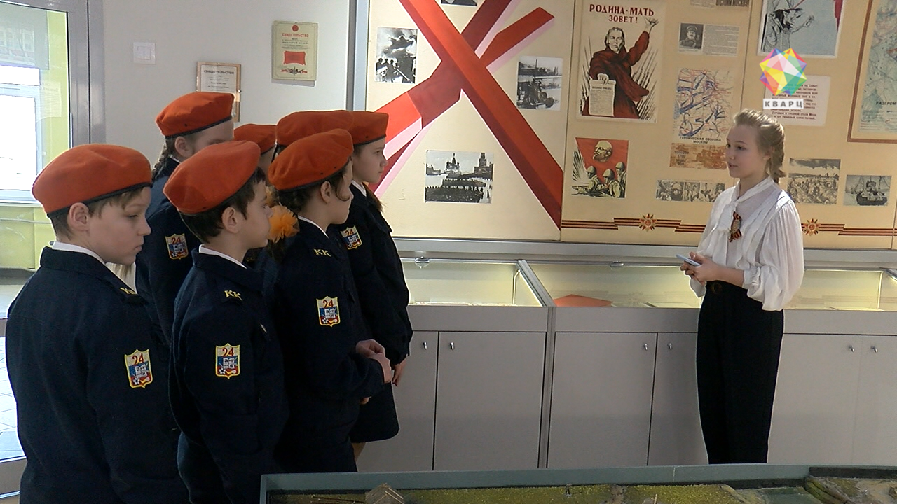 Ученики 18 школы проводят первую экскурсию для почетных гостей в своем обновленном музее. О подвиге Подольских курсантов теперь не просто рассказывают, а наглядно демонстрируют все происходящее на макете Ильинского рубежа. Его, кстати, после съемок картины «Подольские курсанты» школе подарила студия «Военфильм». Добавились и другие экспонаты. На окнах - информация о главнокомандующих. Новые объекты с раскопок. Точные копии знамен Пехотного и Артиллерийского училищ. А на потолке - голубое, чистое небо как символ Великой Победы.