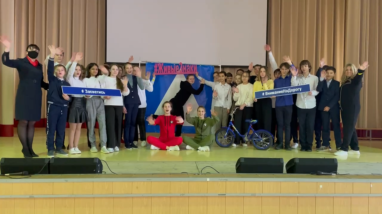 Автоинспекторы провели тематическую викторину и рассказали ребятам о правилах поведения на проезжей части и в транспорте. Праздник «Живые знаки» завершился танцевальным флешмобом и совместным фото на память.