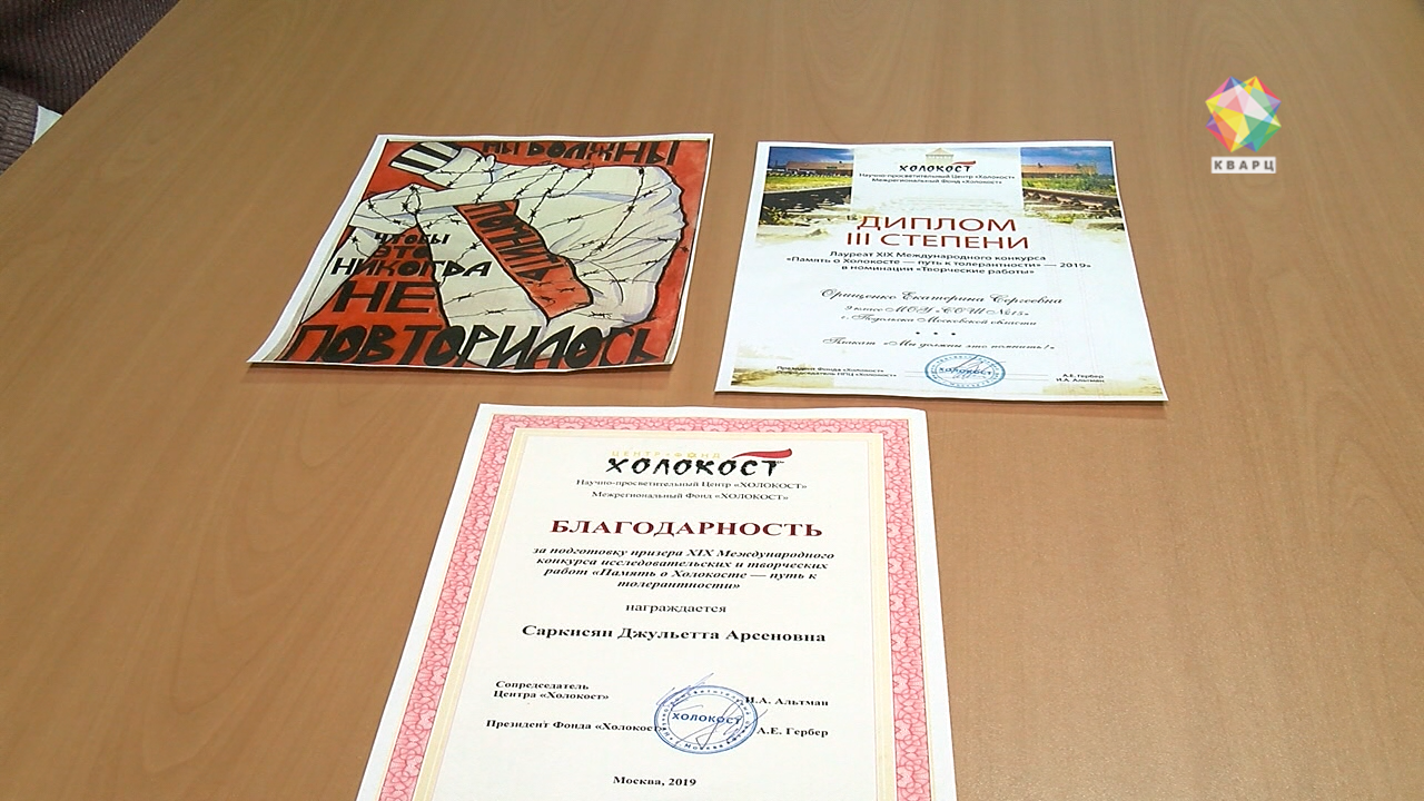 В словах школьницы вся суть проводимого вот уже в 19 раз международного конкурса. Не дать поколениям забыть о страшных пытках и испытаниях. Плакат Ирины теперь весит на стенде в кабинете. А внеклассные уроки в 9 «Б» все чаще посвящают Великой Отечественной. Сегодня говорили о холокосте.