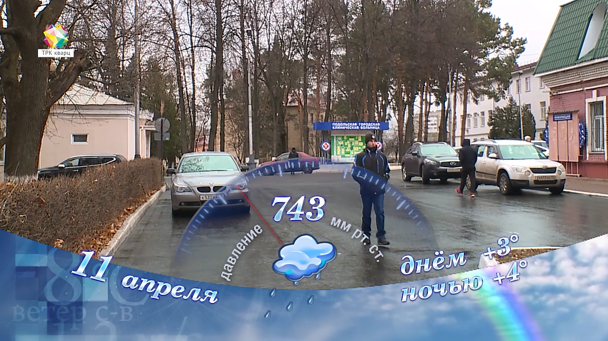 В понедельник, 11 апреля, в Подольске пасмурно, дождь. Температура воздуха ночью +4, днём +3 градуса; атмосферное давление 743 мм ртутного столба; ветер северо-восточный 4 м/с; относительная влажность воздуха 95%