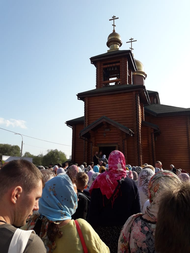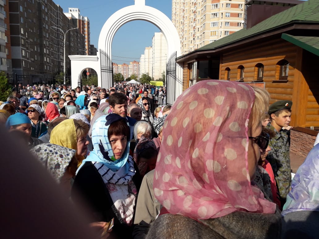 Паломники из разных городов Подмосковья прибыли в Кирилло-Мефодиевский храм. Очередь растянулась на сотни метров.