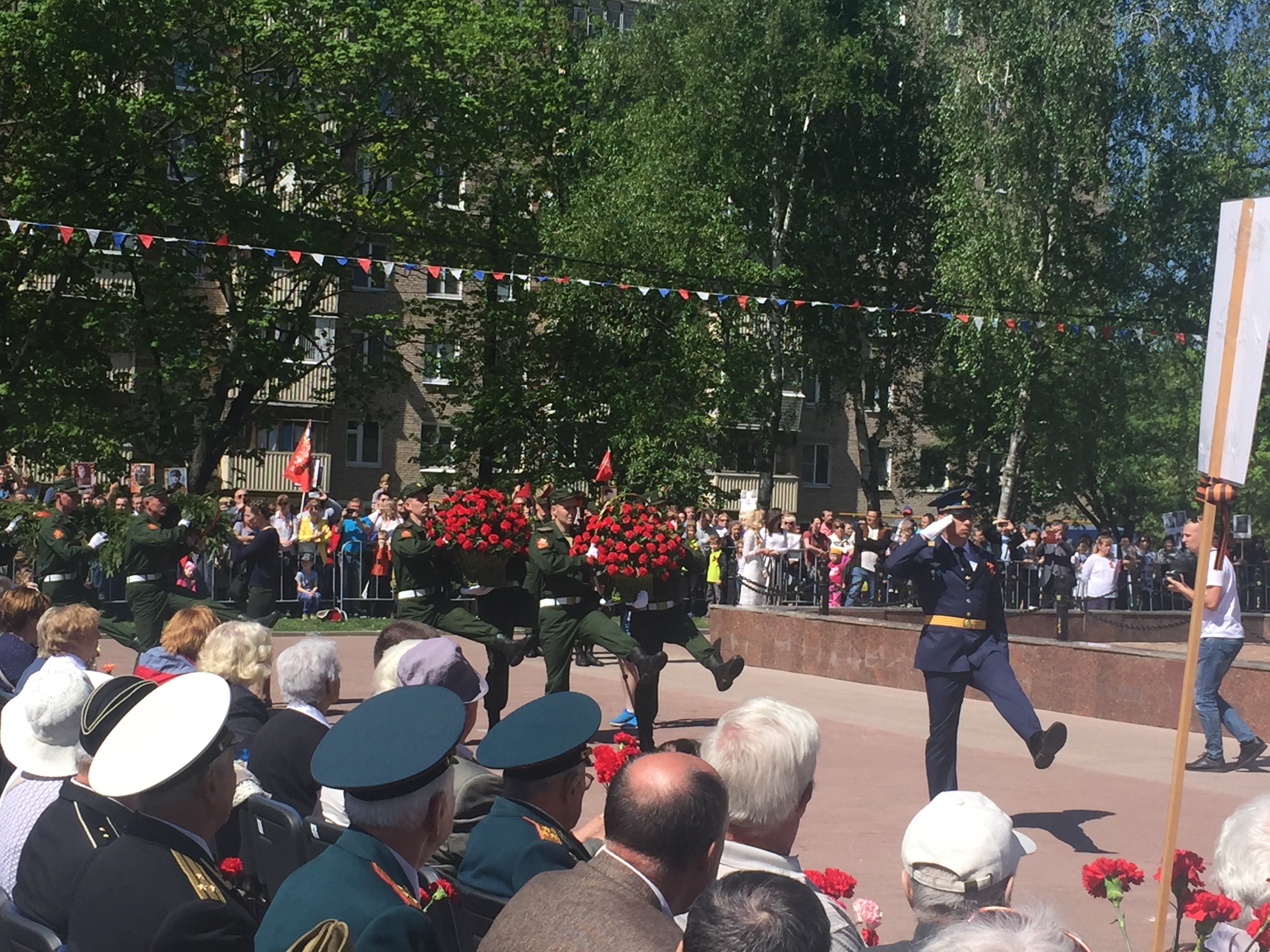 Во главе колонны портреты Героев Советского Союза. А эти фамилии - Жуков, Ворошилов, Рокоссовский, Говоров, Малиновский снова слышны в округе. Лучшие полководцы той войны. Цветы, песни и неподдельное счастье в глазах и сердцах, как тогда, в 45-м. Сегодня в знак памяти о Дне Победы на груди каждого развиваются Георгиевские ленты, и это еще не все, пилотки тех времен, гимнастерки, флаги. Военной атрибутики в парадном марше все больше, как и самих участников. На главные улицы Подольска вышли тысячи жителей. Преодолели путь от площади Ленина до площади Славы под победные крики ура.