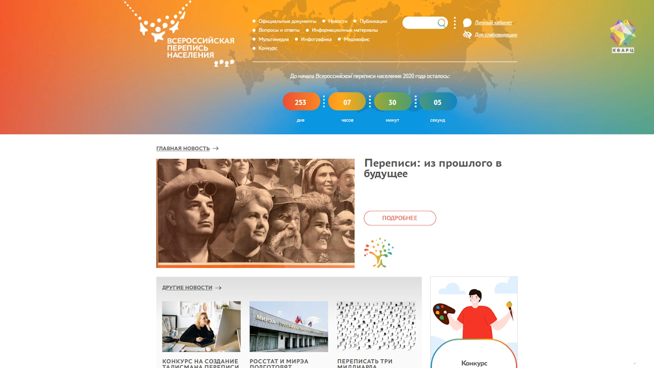 Конкурс пройдёт в два этапа - открытое голосование на сайте переписи населения и оценка жюри. Приём работ закончится 10 февраля. А сама перепись населения начнется через 253 дня.