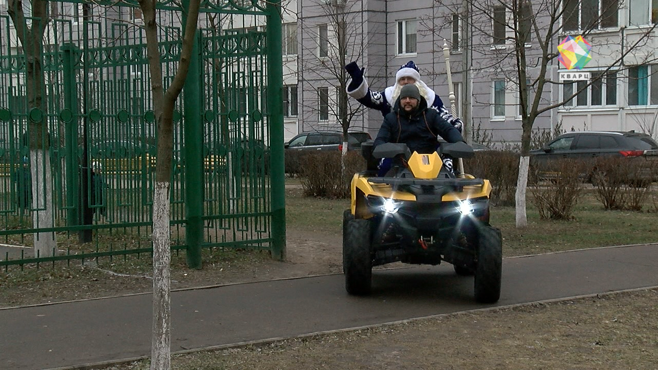 Сказочные персонажи, Снегурочка и Дед Мороз, приехали на квадроцикле. Совсем молодая управляющая компания «Пересвет-Подольск» работает только с октября. Но это не помешало ей устроить праздник для своих жителей.