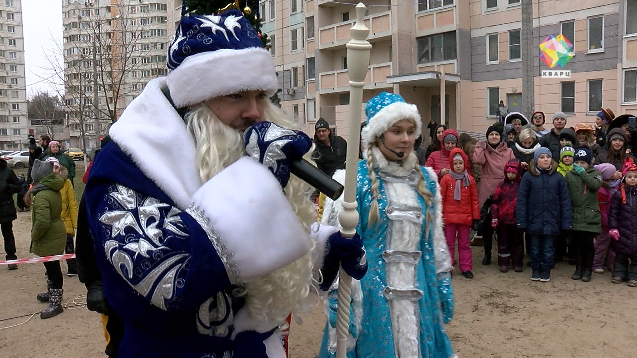 Около дома 11, б по улице Юбилейная зажгли елку и отметили это песнями и танцами. Дед Мороз и Снегурочка, сказочные персонажи, десятки веселых мальчишек и девчонок.