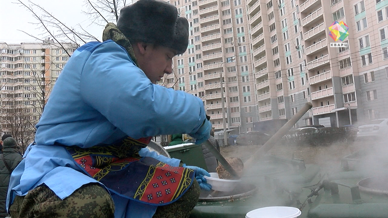 Снегурочка и Дед Мороз поздравили ребят теплыми пожеланиями и подарками. А всем, кто замерз, на полевой кухне раздавали бутерброды, горячий чай и вкусную гречневую кашу. Для детей, уставших от конкурсов, это было как раз кстати.