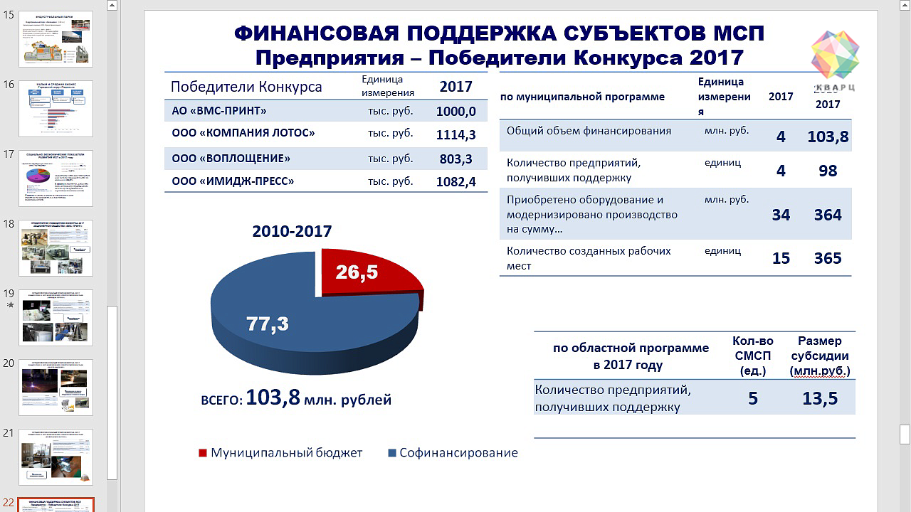 В 2017 году из городского бюджета было выделено 4 миллиона на субсидии для четырех подольских предприятий, выигравших соответствующий конкурс. Это помогло компаниям провести модернизацию производства, увеличить объемы, создать новые рабочие места.