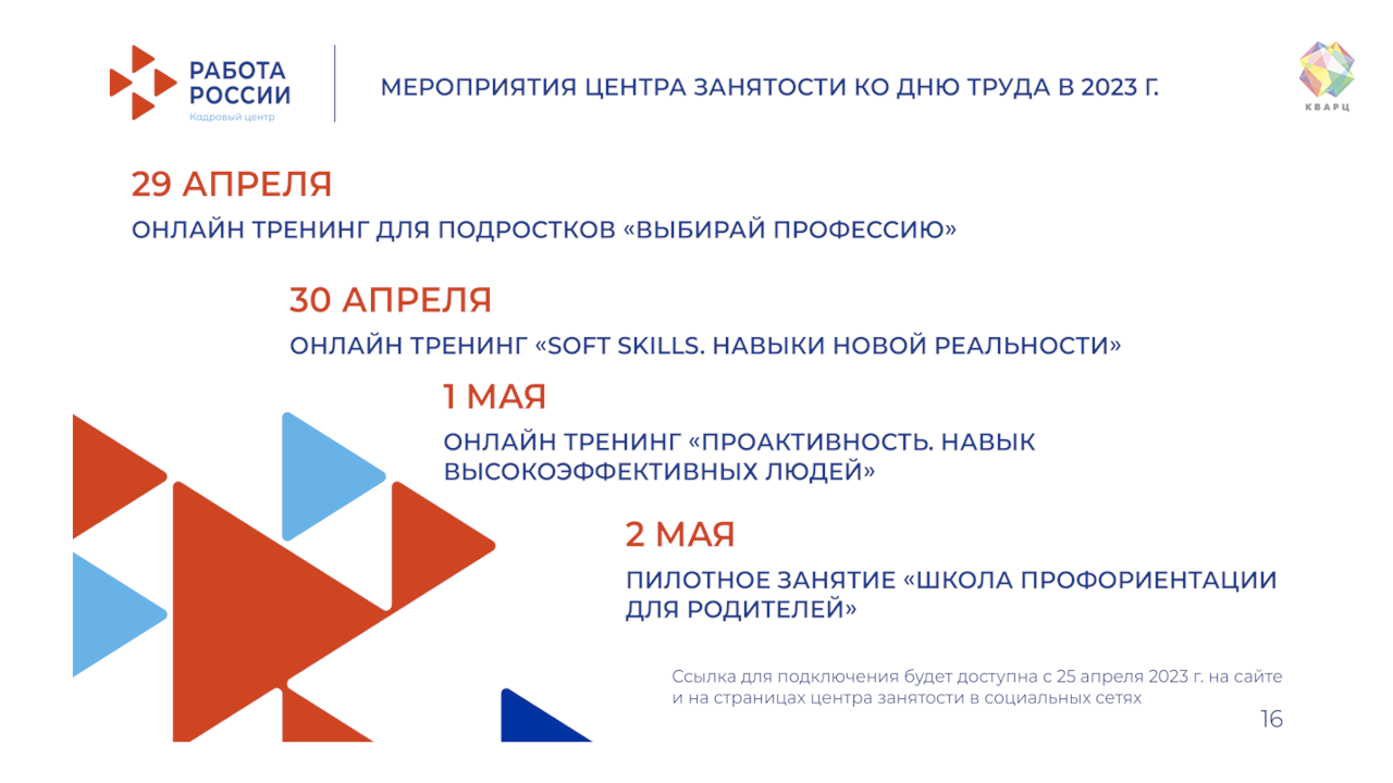 А чтобы ближе познакомиться с работой центра занятости, все желающие могут принять участие в мероприятиях, которые будут приурочены ко Дню труда. Вот их расписание: