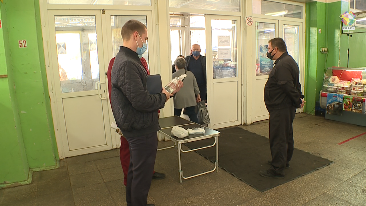 Проверка рынка начинается с самого входа. Антисептик и маски для покупателей на месте.