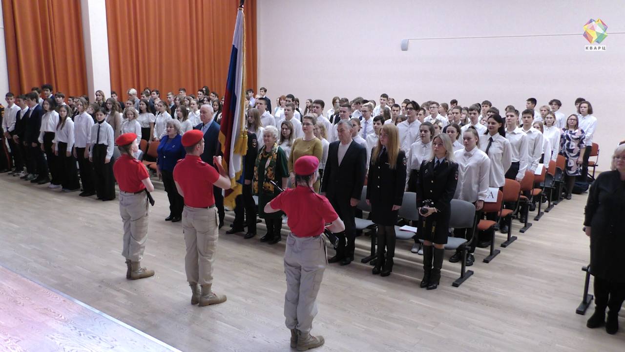 Торжественный вынос флага и исполнение гимна - так начинается урок мужества. Сегодня у старшеклассников особенные гости - ветераны и действующие сотрудники правоохранительных органов.