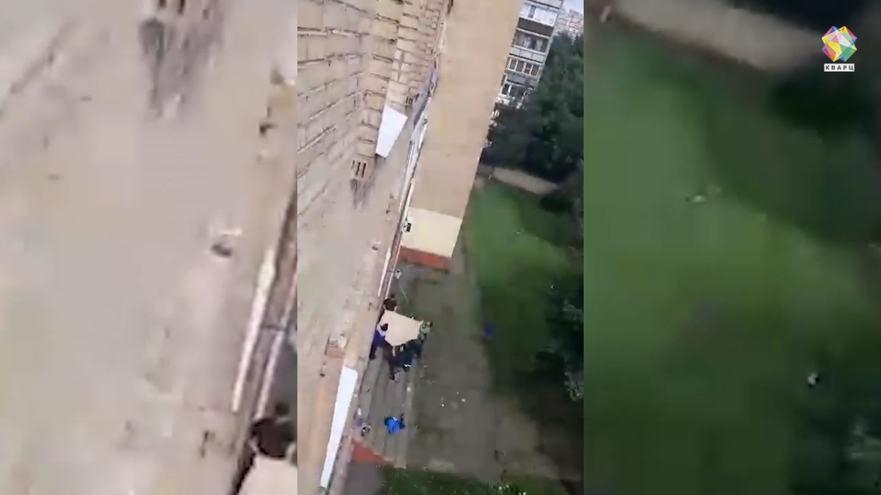 Шокирующие кадры увидели обычные работяги и жители дома. Среагировали молниеносно - растянув под окнами четвертого этажа одеяло.