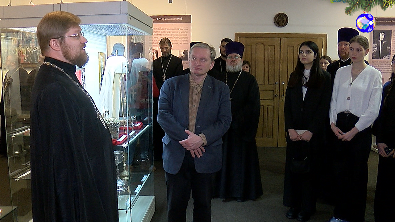 Экскурсию для первых посетителей проводит клирик Троицкого собора, иерей Георгий Харин. Он подробно рассказывает о содержании новой экспозиции и об уникальных предметах, представленных в музее сегодня. В центре внимания - церковь в начале XX века. В это непростое революционное время на её защиту встали истинно верующие.