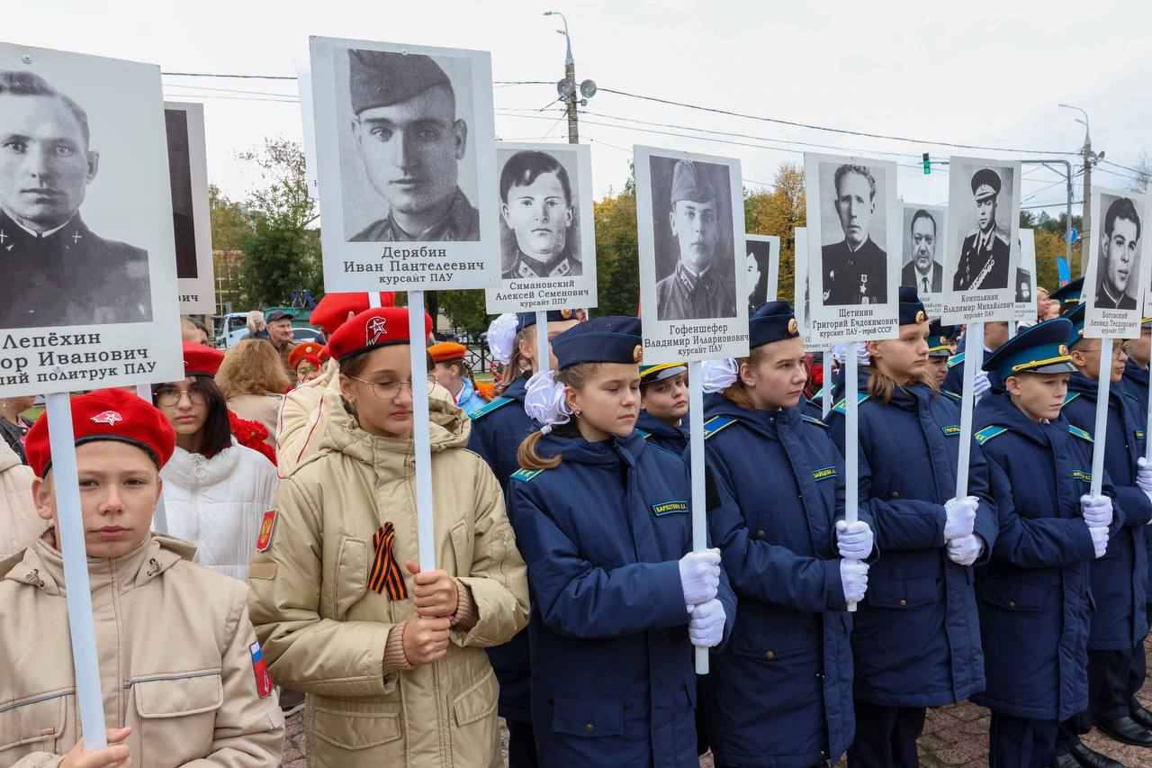Школьники округа держат в руках портреты героев. В этих лицах - история нашего города и всей страны. Ровно 83 года назад, 5-го октября 1941 курсанты пехотного и артиллерийского училищ Подольска встали на защиту Родины. Враг стремительно подступал к столице, но на Ильинском рубеже путь ему преградили красные юнкера.
