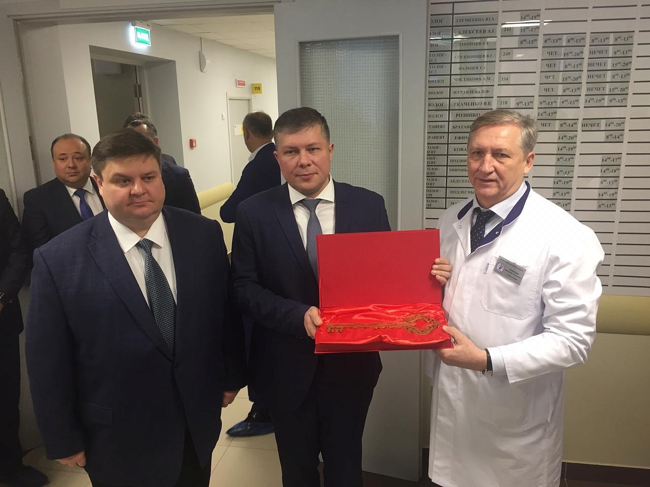 Прежде чем отправиться на экскурсию руководитель проекта передает главному врачу символичный ключ. С этого момента поликлинику в Кузнечиках можно считать открытой!