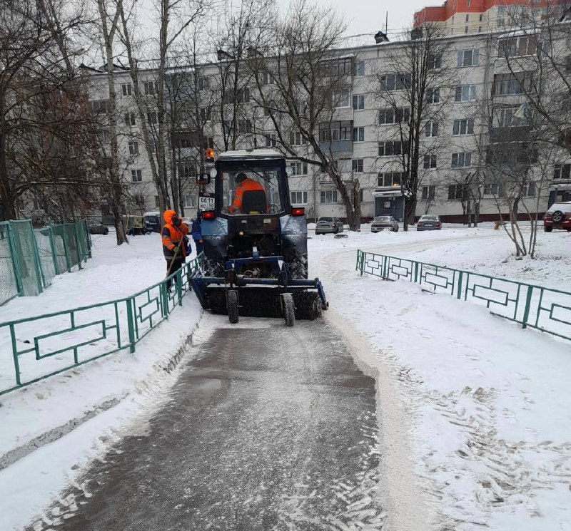 С ночи коммунальные службы проводят работы по очистке и обработке дорог противогололедными материалами, сообщает администрация округа.