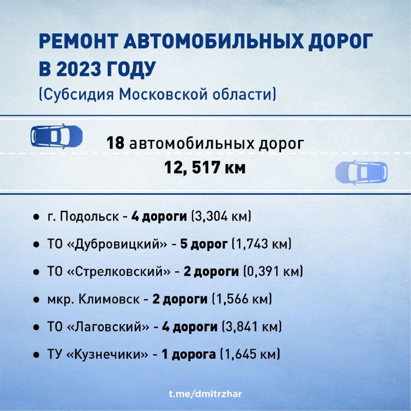 Адресный перечень не окончательный и будет корректироваться. Кроме того, в планах - реконструкция автодороги «Дубровицы - б/о «Мечта»» протяженностью 5,1 км. Там расширят проезжую часть, устроят 4 остановочных павильона и обустроят съезд к лыжероллерной трассе.