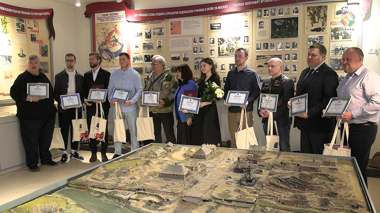 Трудятся не только на полях, где велись бои, но и в архивах. Игорь Красильников - тоже обладатель премии Панкова, вручает директору 18 школы имени Подольских курсантов, где и проходило награждение, свою исследовательскую работу - о первых ста днях войны. После торжественной части для гостей провели экскурсию в школьном музее.