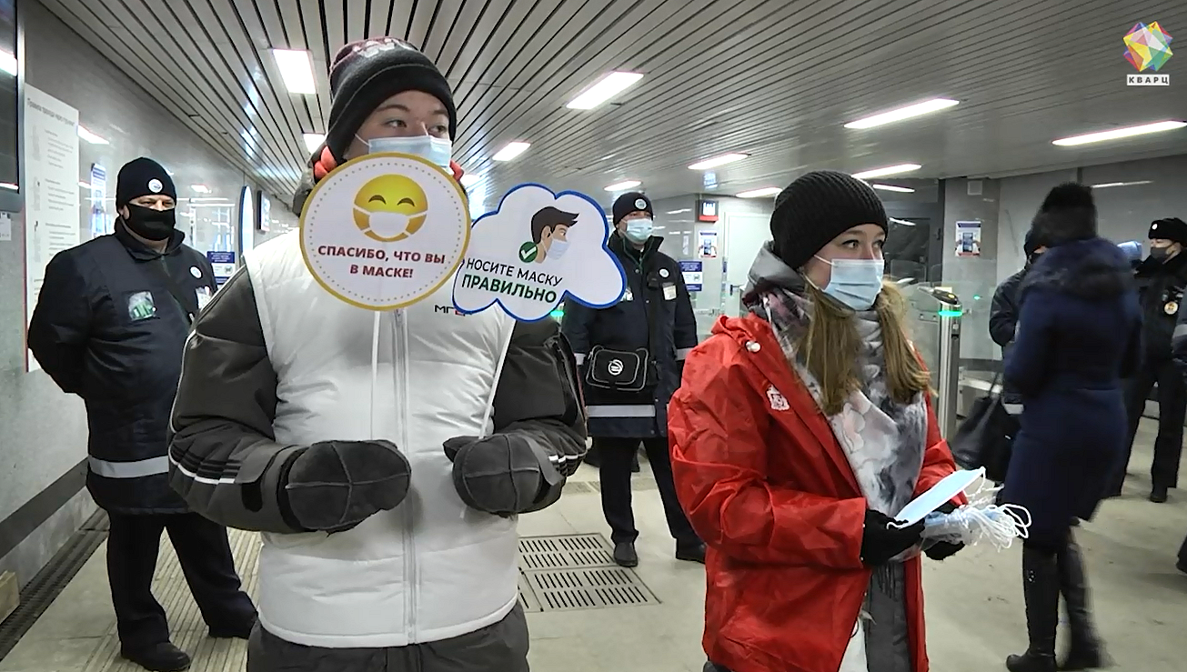 Морозное утро четверга, молодые люди пытаются согреть пассажиров МЦД не только призывами о необходимости носить маски, но и хорошим настроением. Атрибутика соответствующая. Как и слова, которые вот уже на протяжении нескольких месяцев, пытаются донести волонтеры.