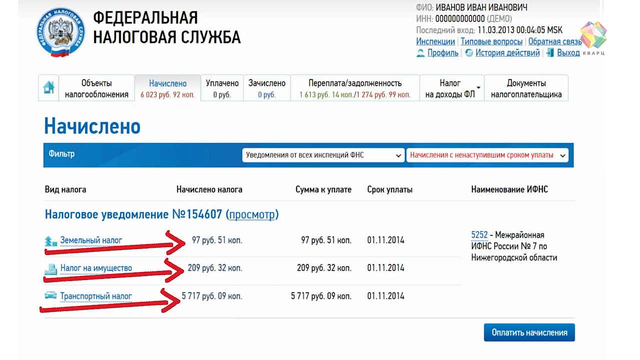 Произвести оплату можно любым удобным способом: через отделения банков и их терминалы, а также с помощью электронных сервисов. Подключившись к личному кабинету налогоплательщика на сайте ФНС можно получить полную информацию о состоянии счетов и ознакомиться с налоговыми обязательствами, и, наконец, обратиться к налоговому инспектору с вопросом онлайн.