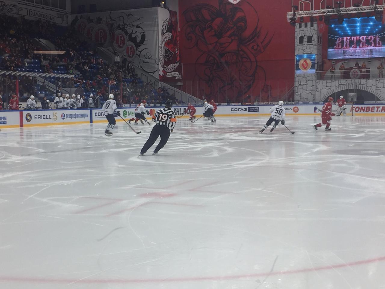 Бодро, оживленно и очень опасно! Именно так можно охарактеризовать начало игры «Витязя» и «Адмирала». Ворота богатырей защищает Александр Самонов. И едва первый период перевалил за экватор - счёт открыт! 0:1. Шайбу забросил Карел Кубат с передачи Сергея Конькова и Глеба Зайцева.