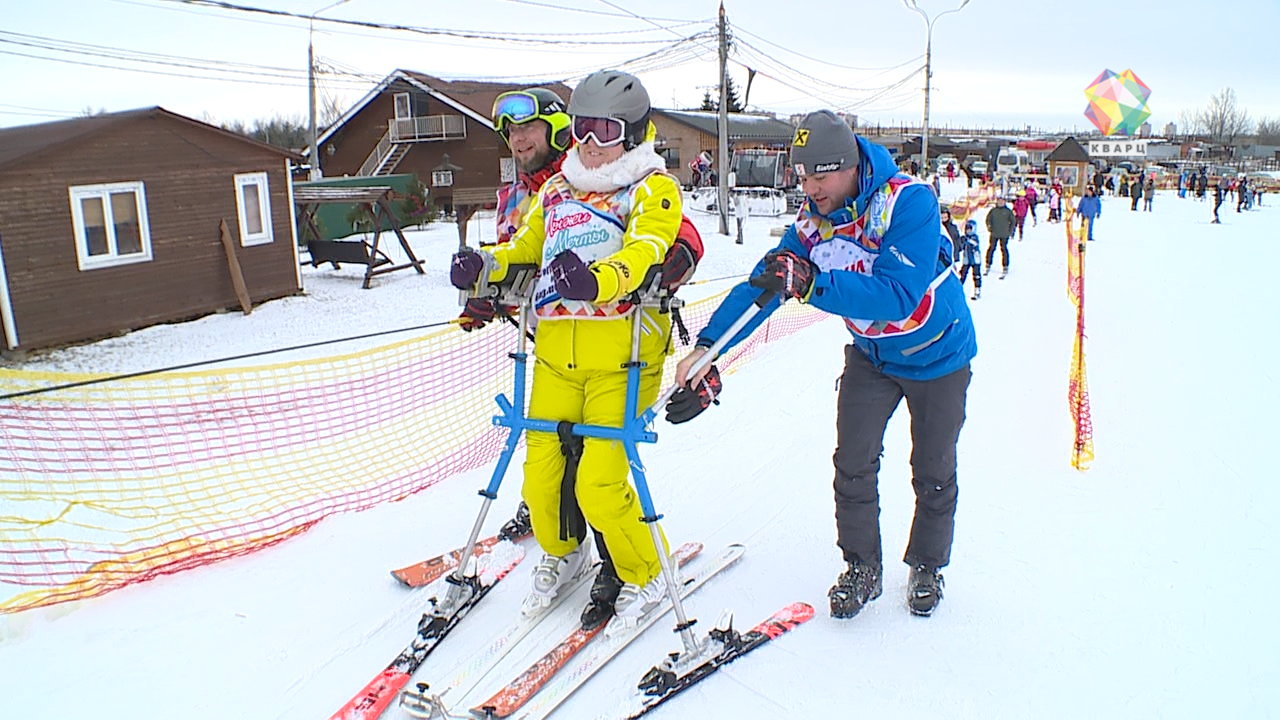Андрей Соколов готовится к новому спуску. Помогают инструкторы и самые близкие - мама и бабушка. Они закрепляют парня на специальном устройстве. У Андрея ДЦП. Он не может самостоятельно передвигаться, но уже второй год приезжает кататься на лыжах.