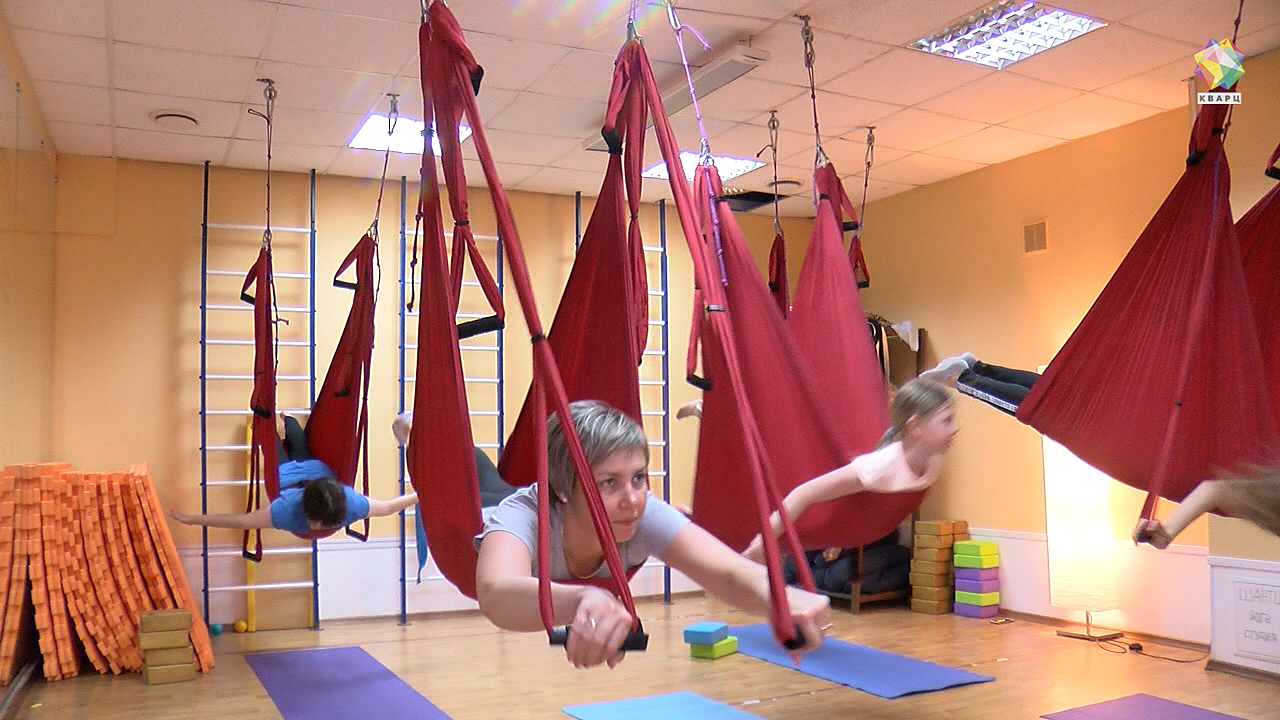 - На мой взгляд, здесь есть возможность разгрузить скелетно-костную систему. Вы можете сделать элементы, которые на коврике вам даются сложнее. Здесь делаются чуть легче. Часть веса забирает гамак, - говорит Вадим.