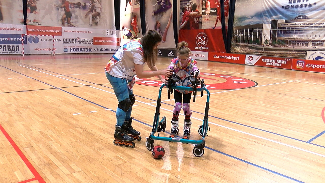 Юле скоро исполнится 10 лет. У нее сразу несколько диагнозов, в том числе детский церебральный паралич. В школу не ходит, зато спорт любит и сегодня решила научиться кататься на роликах.